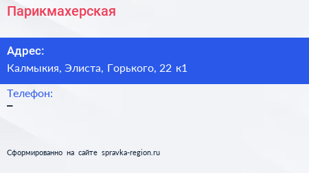 Парикмахерская по адресу Калмыкия, Элиста, Горького, 22 к1 в дальнейшем Организация, размещена в следующих категориях: