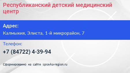 Республиканский детский медицинский центр по адресу Калмыкия, Элиста, 1-й микрорайон, 7 в дальнейшем Организация, размещена в следующих категориях: