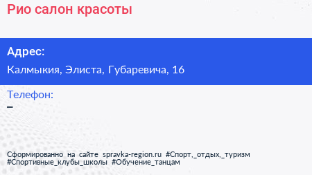 Рио, салон красоты по адресу Калмыкия, Элиста, Губаревича, 16 в дальнейшем Организация, размещена в следующих категориях:
