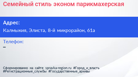 Семейный стиль, эконом-парикмахерская по адресу Калмыкия, Элиста, 8-й микрорайон, 61а в дальнейшем Организация, размещена в следующих категориях: