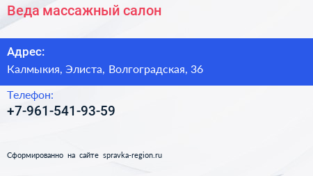Веда, массажный салон по адресу Калмыкия, Элиста, Волгоградская, 36 в дальнейшем Организация, размещена в следующих категориях: