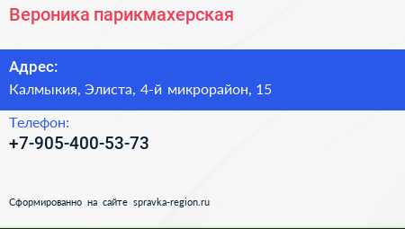 Вероника, парикмахерская по адресу Калмыкия, Элиста, 4-й микрорайон, 15 в дальнейшем Организация, размещена в следующих категориях: