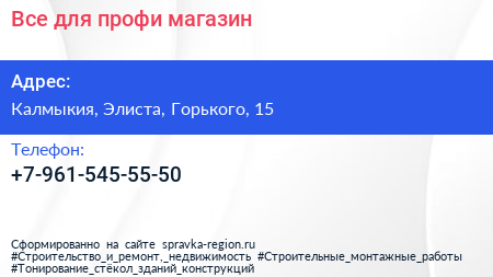 Все для профи, магазин по адресу Калмыкия, Элиста, Горького, 15 в дальнейшем Организация, размещена в следующих категориях: