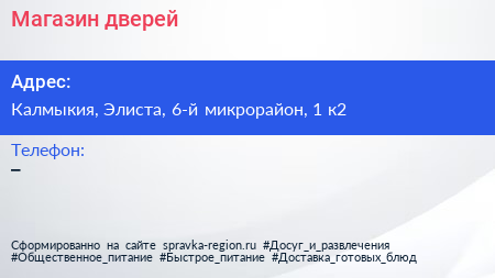 Магазин дверей по адресу Калмыкия, Элиста, 6-й микрорайон, 1 к2 в дальнейшем Организация, размещена в следующих категориях: