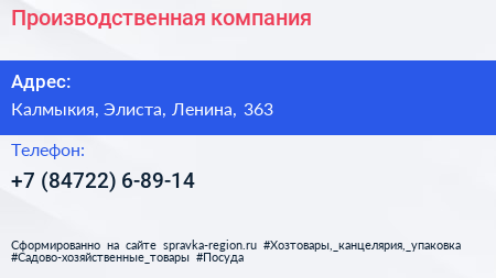 Производственная компания по адресу Калмыкия, Элиста, Ленина, 363 в дальнейшем Организация, размещена в следующих категориях: