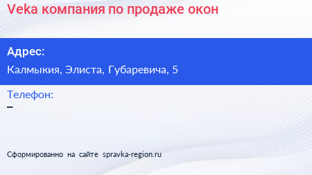 Veka, компания по продаже окон по адресу Калмыкия, Элиста, Губаревича, 5 в дальнейшем Организация, размещена в следующих категориях: