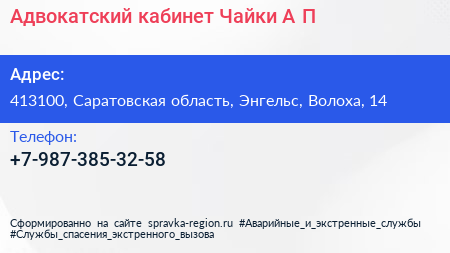 Адвокатский кабинет Чайки А.П. по адресу 413100, Саратовская область, Энгельс, Волоха, 14 в дальнейшем Организация, размещена в следующих категориях: