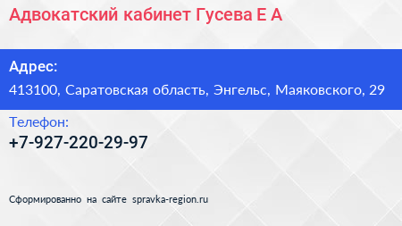 Адвокатский кабинет Гусева Е.А. по адресу 413100, Саратовская область, Энгельс, Маяковского, 29 в дальнейшем Организация, размещена в следующих категориях: