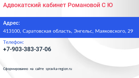 Адвокатский кабинет Романовой С.Ю. по адресу 413100, Саратовская область, Энгельс, Маяковского, 29 в дальнейшем Организация, размещена в следующих категориях: