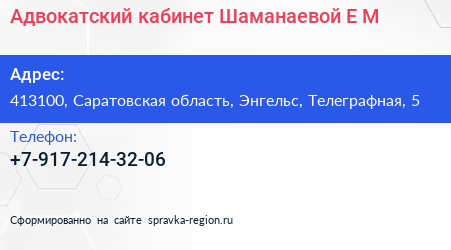 Адвокатский кабинет Шаманаевой Е.М. по адресу 413100, Саратовская область, Энгельс, Телеграфная, 5 в дальнейшем Организация, размещена в следующих категориях: