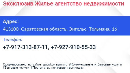 Эксклюзив-Жилье, агентство недвижимости по адресу 413100, Саратовская область, Энгельс, Тельмана, 16 в дальнейшем Организация, размещена в следующих категориях: