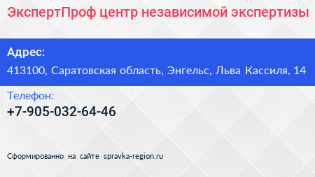 ЭкспертПроф, центр независимой экспертизы по адресу 413100, Саратовская область, Энгельс, Льва Кассиля, 14 в дальнейшем Организация, размещена в следующих категориях: