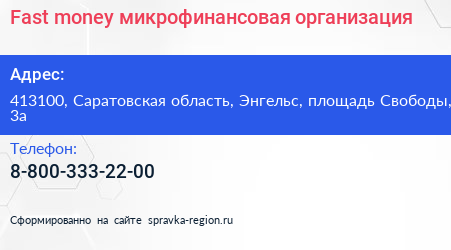 Fast money, микрофинансовая организация по адресу 413100, Саратовская область, Энгельс, площадь Свободы, 3а в дальнейшем Организация, размещена в следующих категориях: