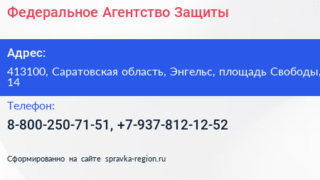 Федеральное Агентство Защиты по адресу 413100, Саратовская область, Энгельс, площадь Свободы, 14 в дальнейшем Организация, размещена в следующих категориях:
