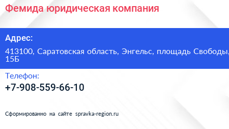 Фемида, юридическая компания по адресу 413100, Саратовская область, Энгельс, площадь Свободы, 15Б в дальнейшем Организация, размещена в следующих категориях: