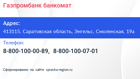 Газпромбанк, банкомат по адресу 413115, Саратовская область, Энгельс, Смоленская, 19а в дальнейшем Организация, размещена в следующих категориях: