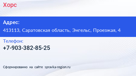 Хорс по адресу 413113, Саратовская область, Энгельс, Проезжая, 4 в дальнейшем Организация, размещена в следующих категориях: