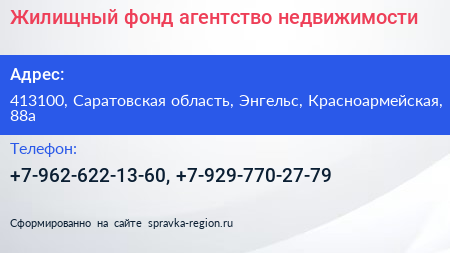 Жилищный фонд, агентство недвижимости по адресу 413100, Саратовская область, Энгельс, Красноармейская, 88а в дальнейшем Организация, размещена в следующих категориях: