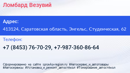 Ломбард Везувий по адресу 413124, Саратовская область, Энгельс, Студенческая, 62 в дальнейшем Организация, размещена в следующих категориях: