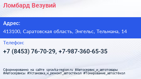 Ломбард Везувий по адресу 413100, Саратовская область, Энгельс, Тельмана, 14 в дальнейшем Организация, размещена в следующих категориях: