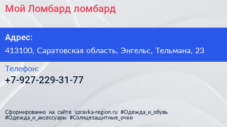 Мой Ломбард, ломбард по адресу 413100, Саратовская область, Энгельс, Тельмана, 23 в дальнейшем Организация, размещена в следующих категориях: