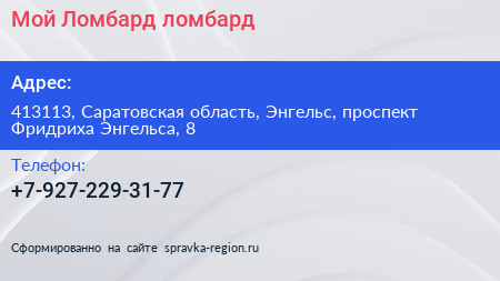 Мой Ломбард, ломбард по адресу 413113, Саратовская область, Энгельс, проспект Фридриха Энгельса, 8 в дальнейшем Организация, размещена в следующих категориях:
