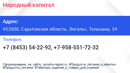 Народный капитал по адресу 413100, Саратовская область, Энгельс, Тельмана, 14 в дальнейшем Организация, размещена в следующих категориях: