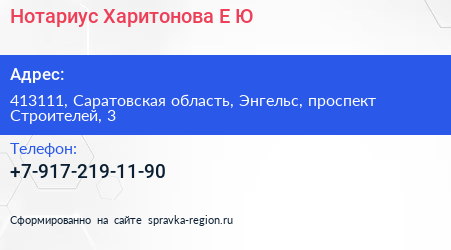 Нотариус Харитонова Е.Ю. по адресу 413111, Саратовская область, Энгельс, проспект Строителей, 3 в дальнейшем Организация, размещена в следующих категориях: