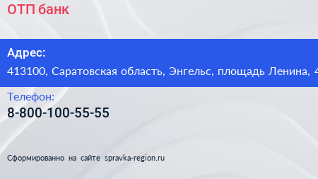 ОТП банк по адресу 413100, Саратовская область, Энгельс, площадь Ленина, 4 в дальнейшем Организация, размещена в следующих категориях: