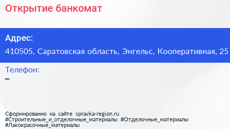 Открытие, банкомат по адресу 410505, Саратовская область, Энгельс, Кооперативная, 25 в дальнейшем Организация, размещена в следующих категориях: