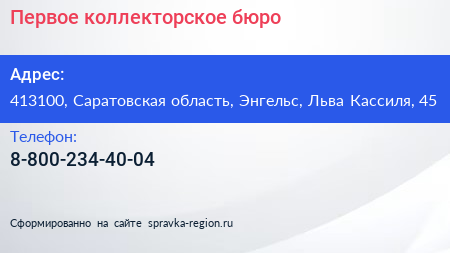 Первое коллекторское бюро по адресу 413100, Саратовская область, Энгельс, Льва Кассиля, 45 в дальнейшем Организация, размещена в следующих категориях:
