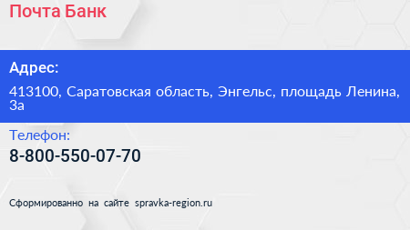 Почта Банк по адресу 413100, Саратовская область, Энгельс, площадь Ленина, 3а в дальнейшем Организация, размещена в следующих категориях: