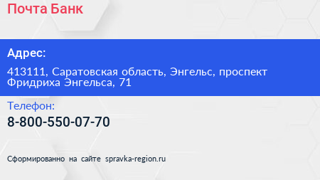 Почта Банк по адресу 413111, Саратовская область, Энгельс, проспект Фридриха Энгельса, 71 в дальнейшем Организация, размещена в следующих категориях: