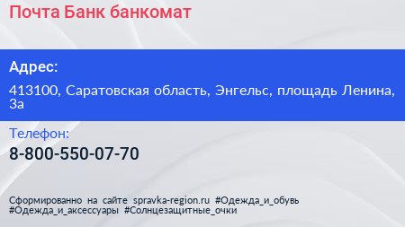 Почта Банк, банкомат по адресу 413100, Саратовская область, Энгельс, площадь Ленина, 3а в дальнейшем Организация, размещена в следующих категориях: