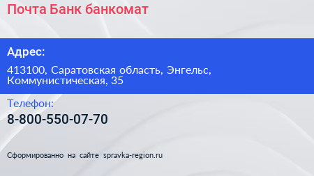 Почта Банк, банкомат по адресу 413100, Саратовская область, Энгельс, Коммунистическая, 35 в дальнейшем Организация, размещена в следующих категориях: