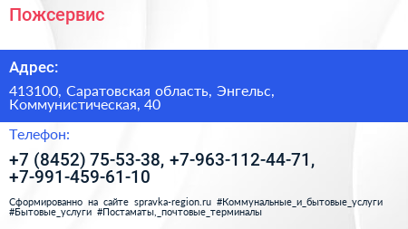 Пожсервис по адресу 413100, Саратовская область, Энгельс, Коммунистическая, 40 в дальнейшем Организация, размещена в следующих категориях: