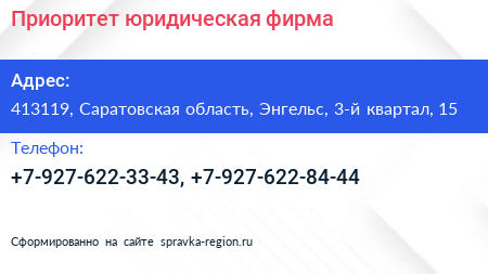Приоритет, юридическая фирма по адресу 413119, Саратовская область, Энгельс, 3-й квартал, 15 в дальнейшем Организация, размещена в следующих категориях: