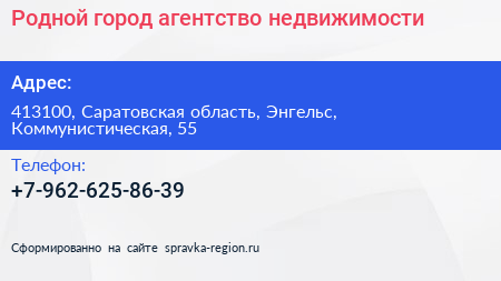Родной город, агентство недвижимости по адресу 413100, Саратовская область, Энгельс, Коммунистическая, 55 в дальнейшем Организация, размещена в следующих категориях: