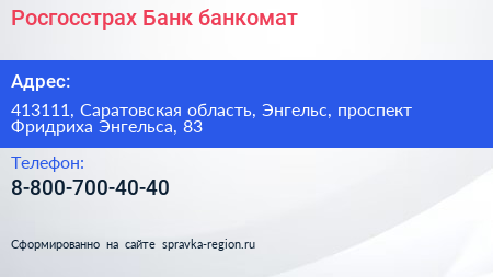 Росгосстрах Банк, банкомат по адресу 413111, Саратовская область, Энгельс, проспект Фридриха Энгельса, 83 в дальнейшем Организация, размещена в следующих категориях: