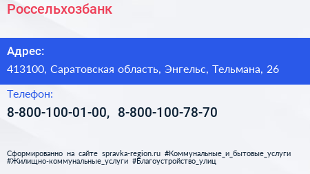 Россельхозбанк по адресу 413100, Саратовская область, Энгельс, Тельмана, 26 в дальнейшем Организация, размещена в следующих категориях: