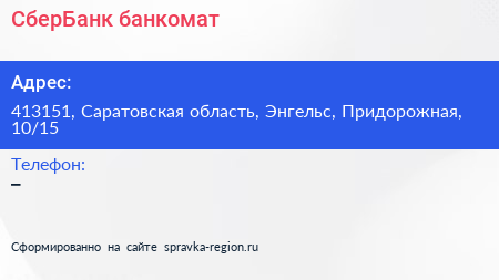 СберБанк, банкомат по адресу 413151, Саратовская область, Энгельс, Придорожная, 10/15 в дальнейшем Организация, размещена в следующих категориях: