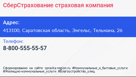 СберСтрахование, страховая компания по адресу 413100, Саратовская область, Энгельс, Тельмана, 26 в дальнейшем Организация, размещена в следующих категориях:
