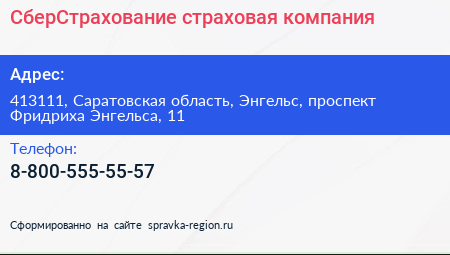 СберСтрахование, страховая компания по адресу 413111, Саратовская область, Энгельс, проспект Фридриха Энгельса, 11 в дальнейшем Организация, размещена в следующих категориях: