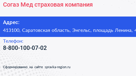 Согаз-Мед, страховая компания по адресу 413100, Саратовская область, Энгельс, площадь Ленина, 4 в дальнейшем Организация, размещена в следующих категориях: