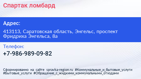 Спартак, ломбард по адресу 413113, Саратовская область, Энгельс, проспект Фридриха Энгельса, 8а в дальнейшем Организация, размещена в следующих категориях: