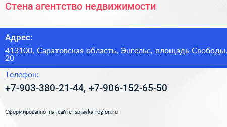 Стена, агентство недвижимости по адресу 413100, Саратовская область, Энгельс, площадь Свободы, 20 в дальнейшем Организация, размещена в следующих категориях: