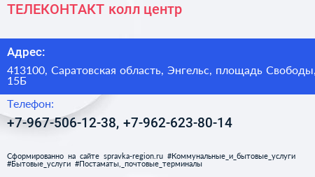 ТЕЛЕКОНТАКТ, колл-центр по адресу 413100, Саратовская область, Энгельс, площадь Свободы, 15Б в дальнейшем Организация, размещена в следующих категориях:
