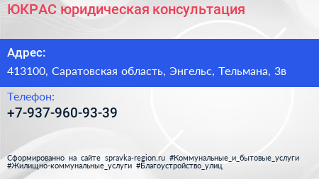ЮКРАС, юридическая консультация по адресу 413100, Саратовская область, Энгельс, Тельмана, 3в в дальнейшем Организация, размещена в следующих категориях: