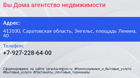 Вы Дома, агентство недвижимости по адресу 413100, Саратовская область, Энгельс, площадь Ленина, 40 в дальнейшем Организация, размещена в следующих категориях: