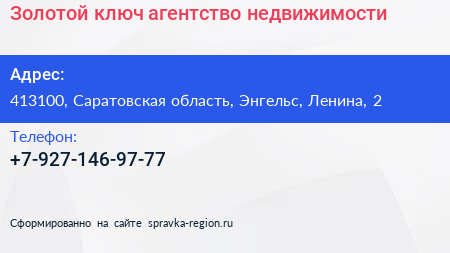 Золотой ключ, агентство недвижимости по адресу 413100, Саратовская область, Энгельс, Ленина, 2 в дальнейшем Организация, размещена в следующих категориях: